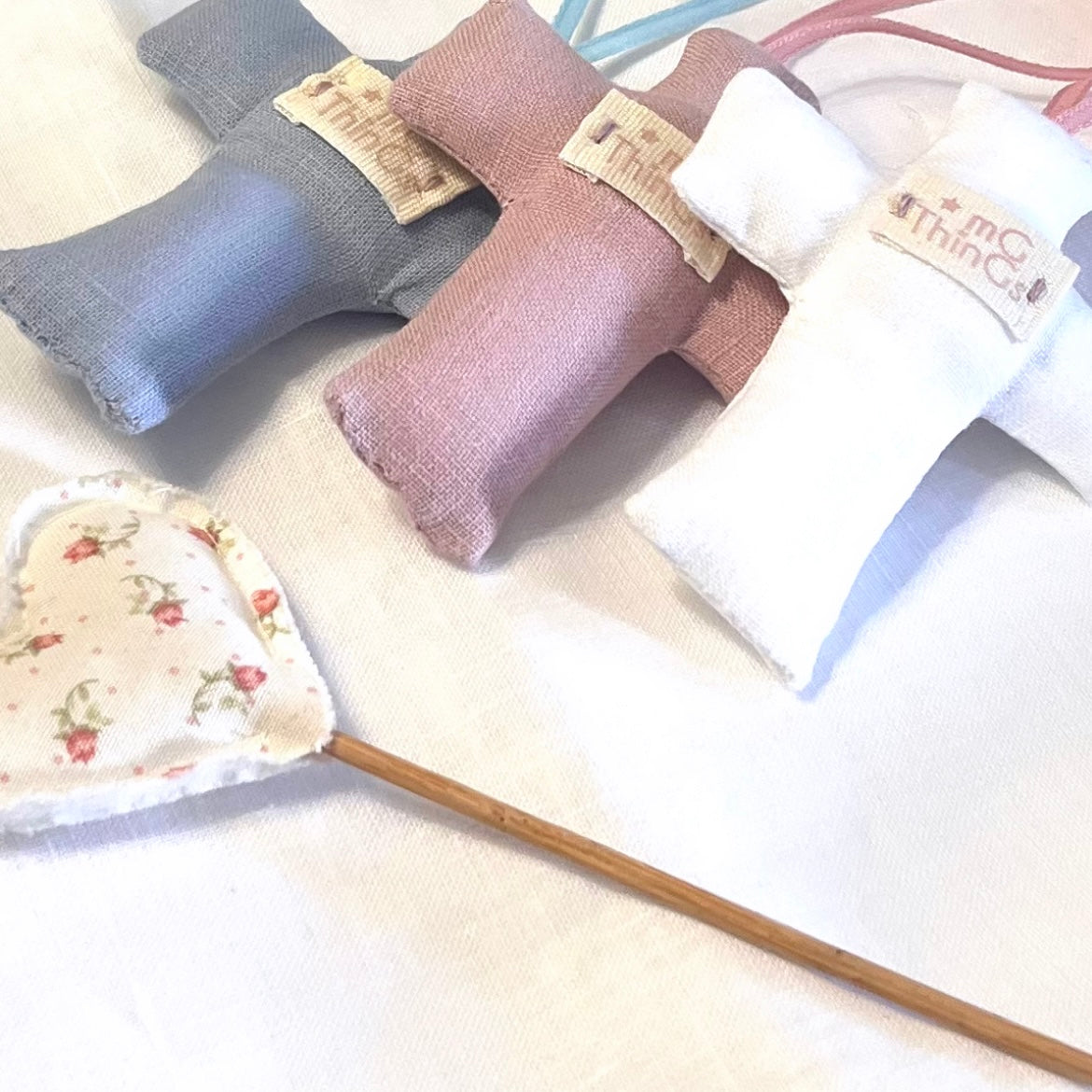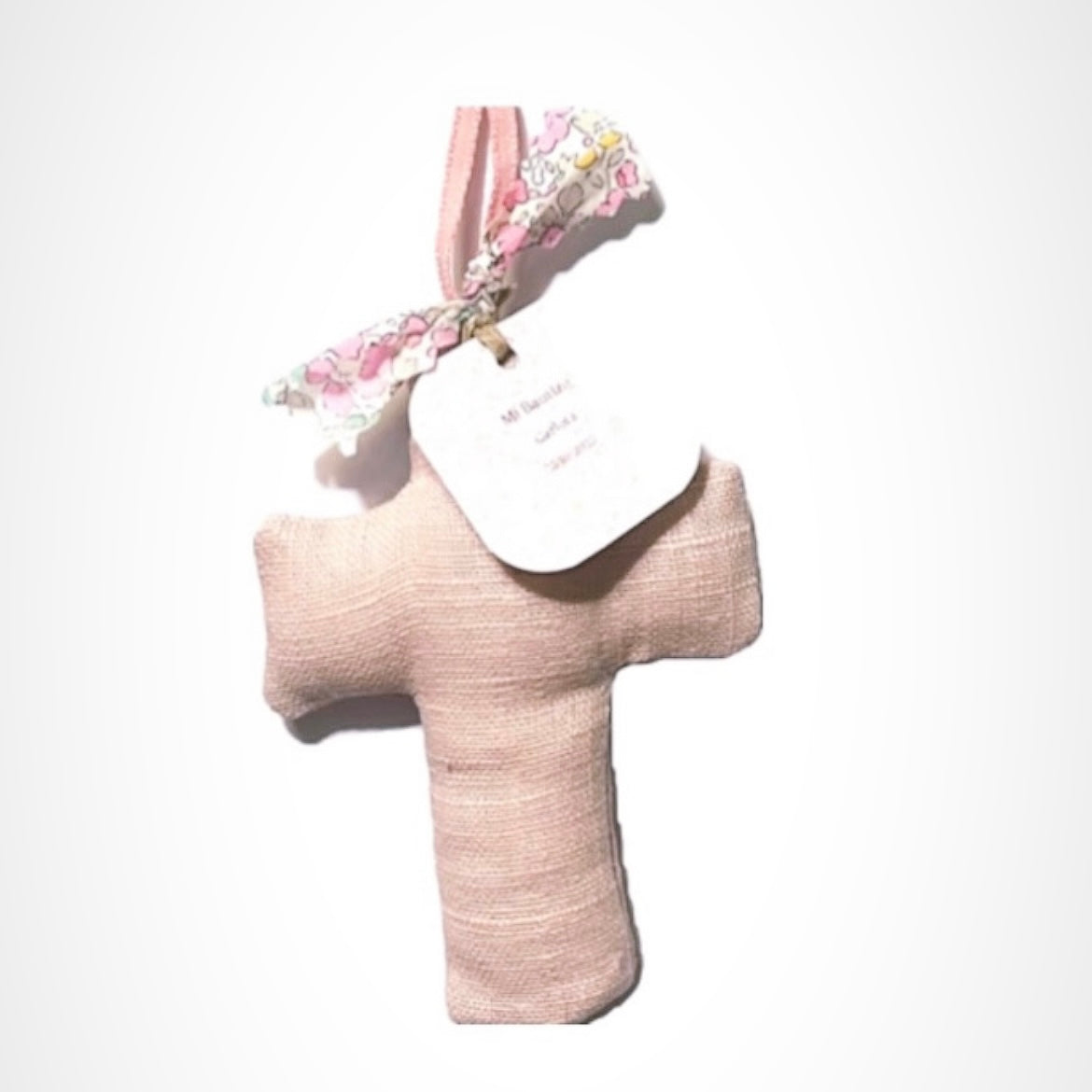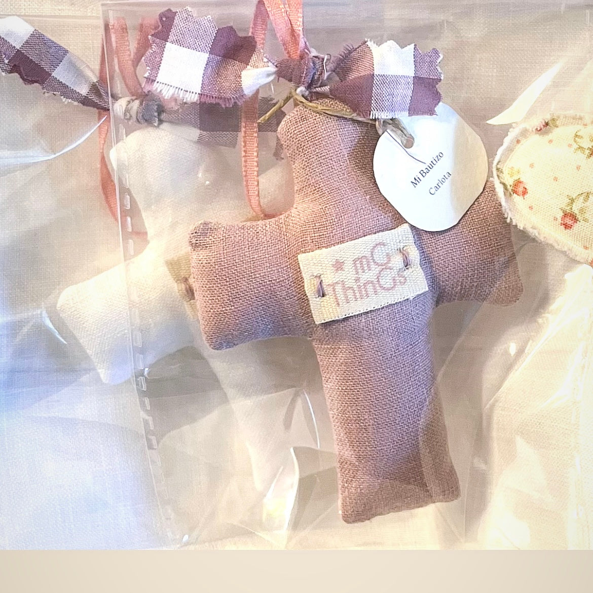 Cruces de lino natural rellenas con algodón y lavanda natural, ideales como detalle de bautizo.